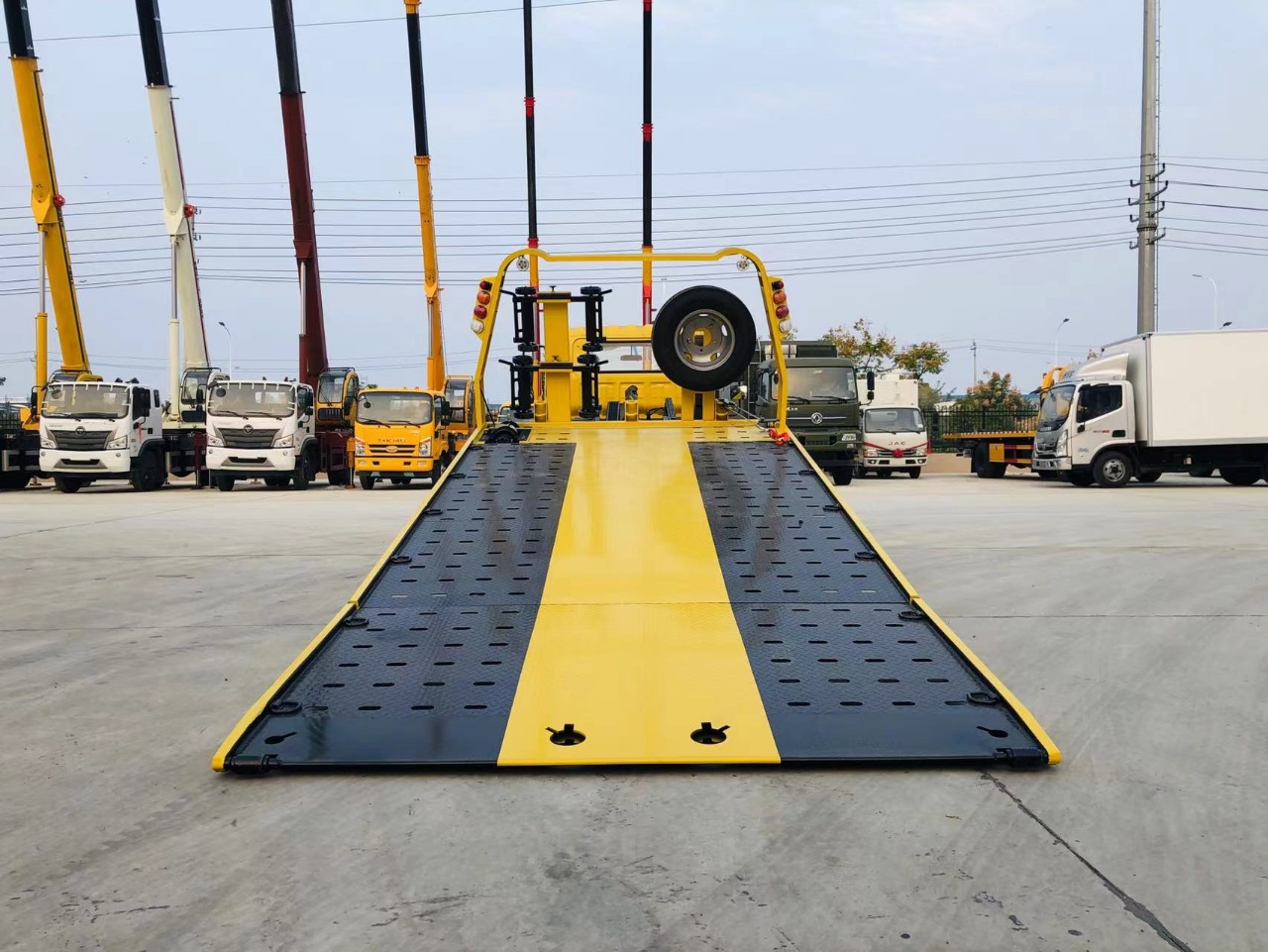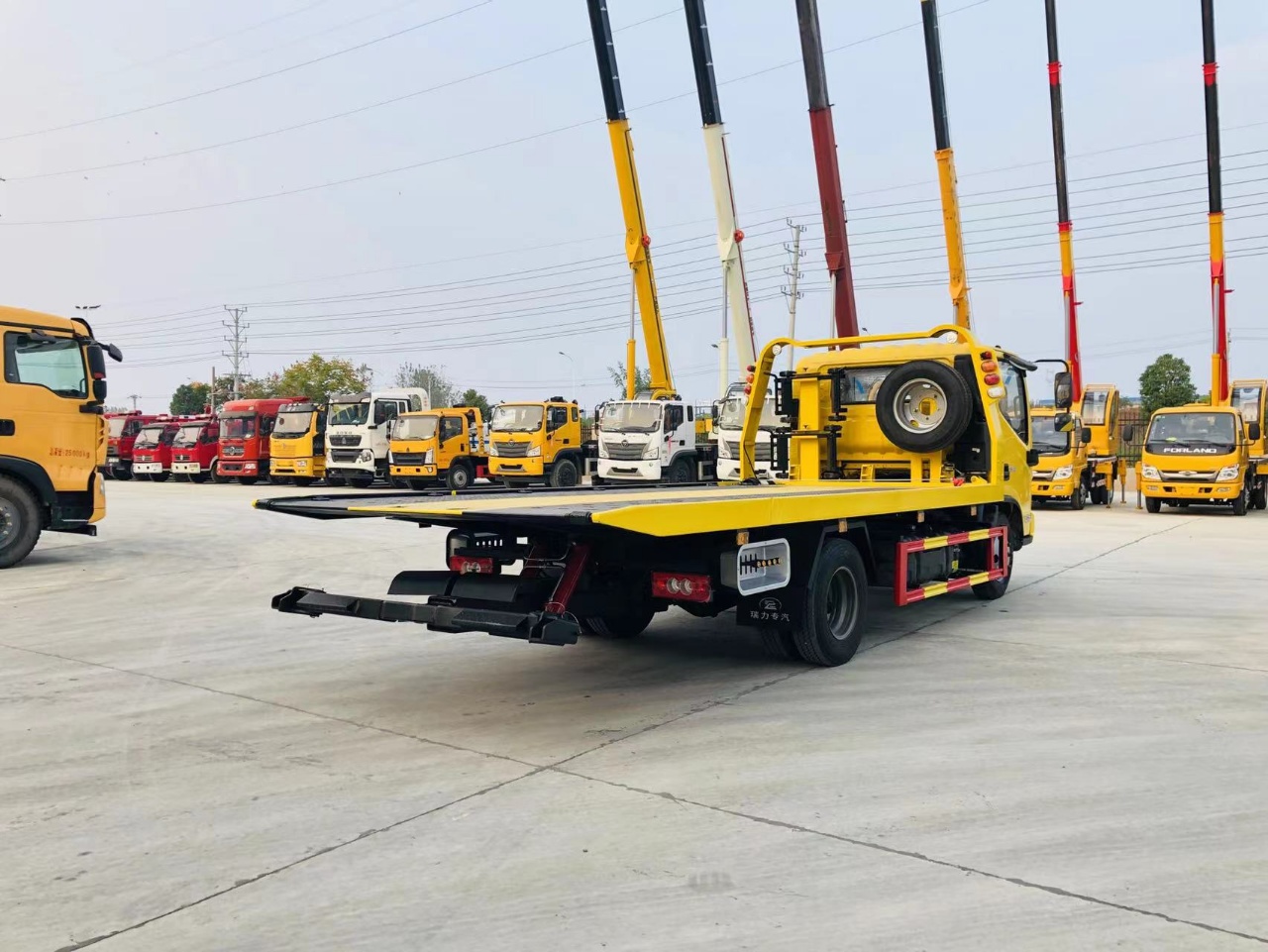 ② 普通翻轉板,平板長4.2米,(尾部90-100公分的液壓翻轉板),寬2.3米,3噸后托臂,雙側聯動操作裝置,1個4噸液壓絞盤,1個工具箱,L型抱胎架1對,擋胎2個,2個**輪小車,4根綁帶.